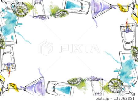 Airy watercolor and ink frame border of cool electric cocktails and shots in turquoise and lavender hues with line and lemon garnish. Hand drawn for summer bar menus, posters, or tropical branding.