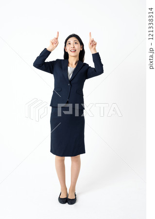 真上を指差すスーツを着た若い女性の全身ポートレート