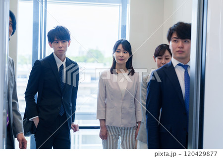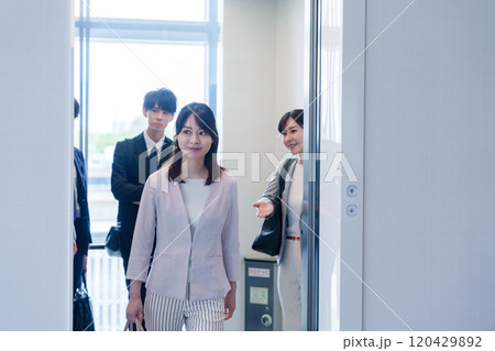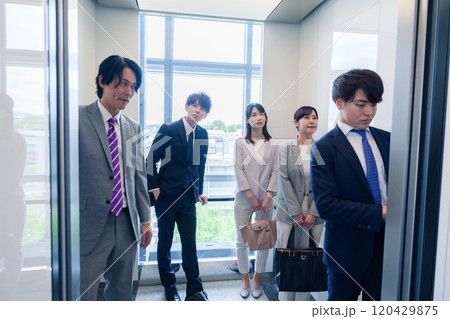 オフィスでエレベーターに乗るビジネスパーソン