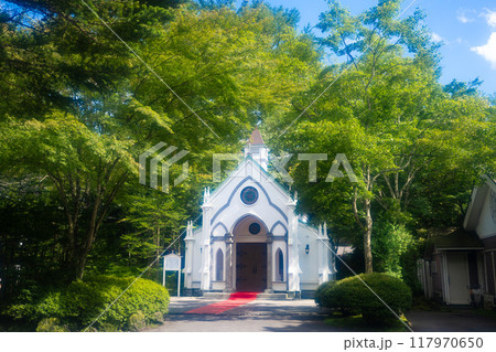夏の旧軽井沢 緑に囲まれた教会(軽井沢ショー記念礼拝堂)