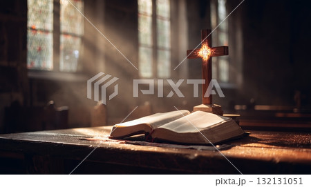 Illuminated cross on wooden table with open book in a serene, sunlit church interior