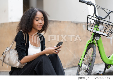 Relaxation and Technology. Young woman sitting on the ground, using her smartphone with a bike beside her.