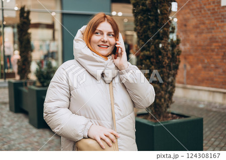 Happy 30s woman talking phone and look happy outdoors. Urban lifestyle concept. Winter time. Beautiful redhead woman walking on the city street.