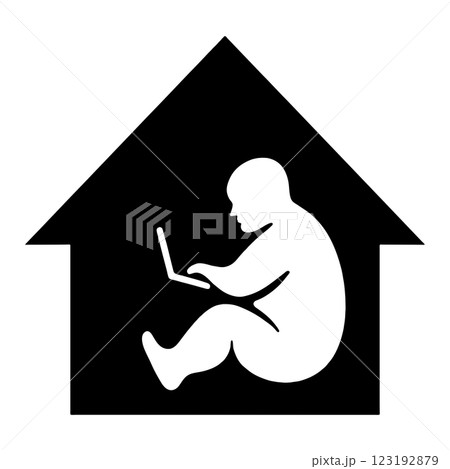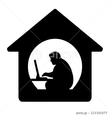 家の中でパソコンの画面を見ている太った引きこもりの男性の黒いシルエットイラスト 透過背景の切り抜き
