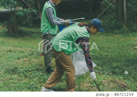 ゴミ拾いをする親子 環境保護 リサイクル 清掃活動 美化運動