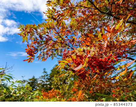 紅葉の始まったナナカマドと青空 (山形県、蔵王連峰)