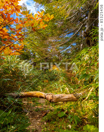 紅葉に囲まれた細い山道を遮る倒木 (山形県、蔵王連峰)