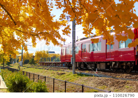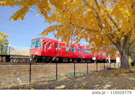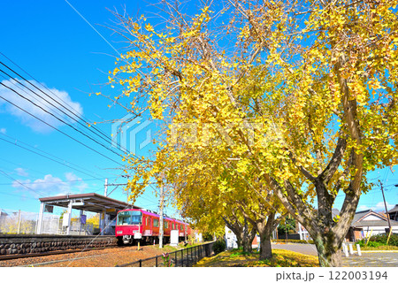 《愛知県》秋の稲沢市祖父江町の黄葉したイチョウと名鉄電車