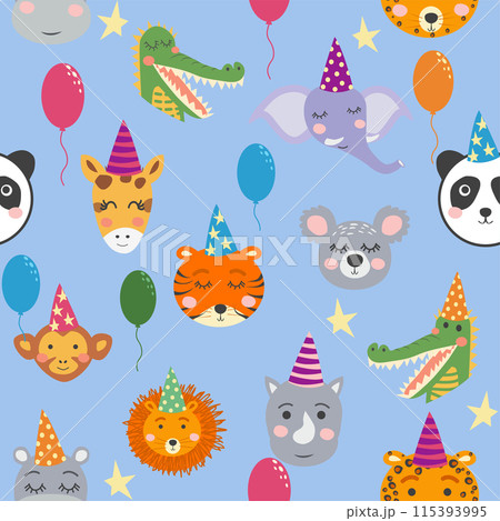 Seamless pattern with cute animal faces. Holiday illustration, birthday, balls, caps
