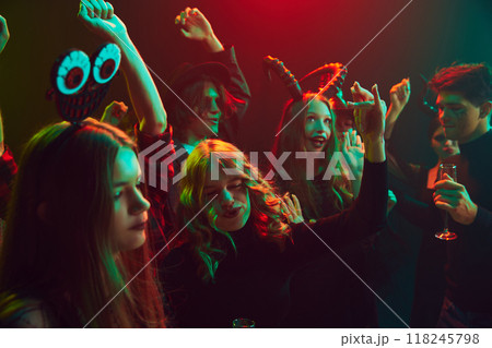 Young cheerful people, friends gathering at nightclub to celebrating Halloween, attending lively party, with costumes ranging from spooky to silly