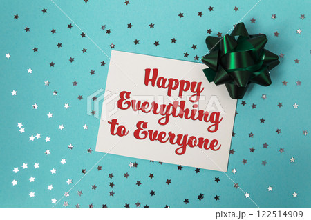 Santa's special delivery: Top-view shot of chic gift boxes, adorned with green bows, gold and green ornaments, star decorations, confetti on black backdrop, space for your festive wishes or promo