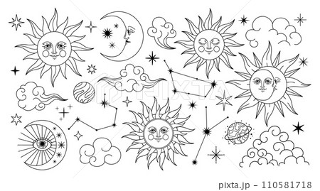 Mystic celestial symbol. Esoteric galaxy elements. Magic spiritual astrology signs, abstract moon, sun, stars, constellations. Graphics alchemy tattoo. Vector set