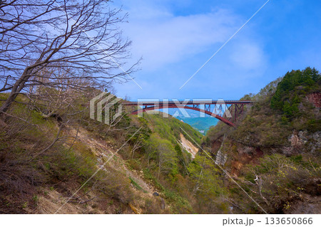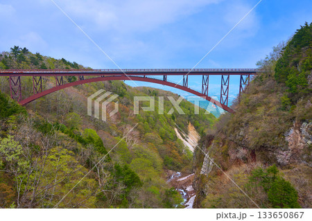 春の福島県福島市のつばくろ谷に架かる不動沢橋,福島市街方面