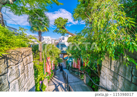 日本の横浜都市景観 6月。弘明寺駅前の商店街を抜けた先。弘明寺・階段などを望む