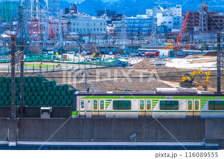 日本の相模原都市景観 橋本駅前で進む中央新幹線の神奈川県駅(仮称)新設工事や鉄塔などを望む