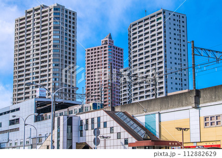 日本の相模原都市景観 橋本駅(南口)や発車した電車、駅前(北口)にそびえるタワーマンションなどを望む