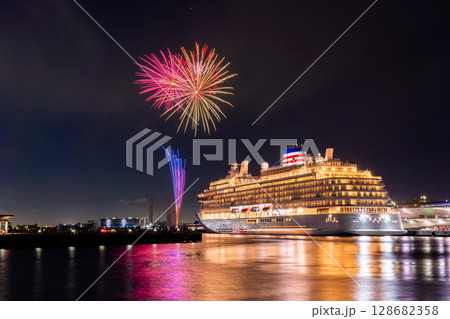 《神奈川県》打上花火と豪華客船・横浜象の鼻パーク