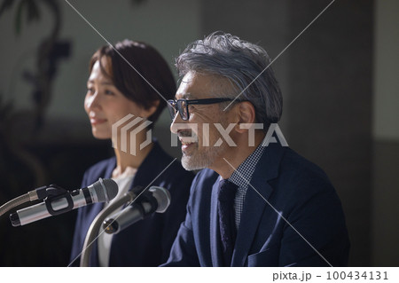 記者会見風のグレイヘアの男性