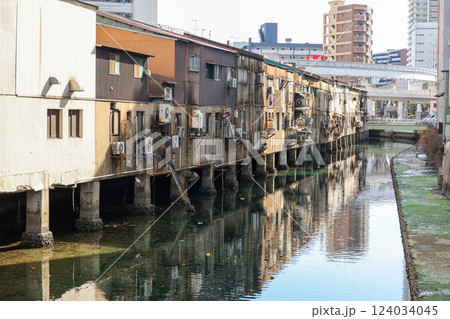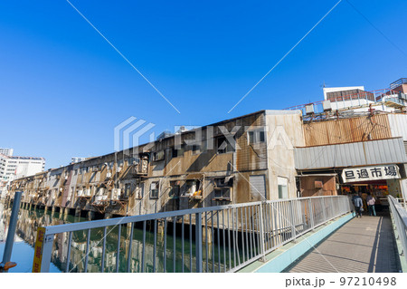 川沿いに建つ古びた建物 旦過市場(たんがいちば)