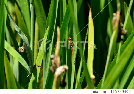 埼玉県深谷市岡の中宿歴史公園 水辺のハスにとまるトンボ