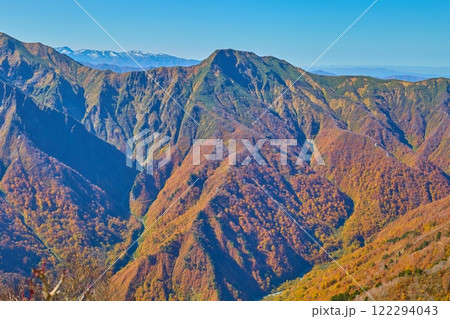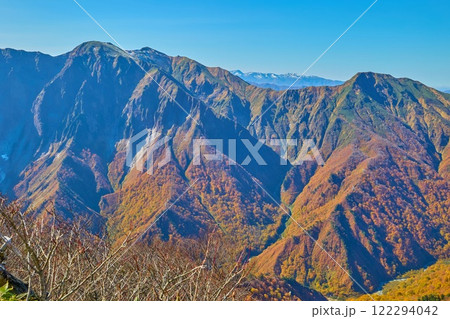 秋の群馬県利根郡みなかみ町の白毛門から西側の武能岳,白樺沢,武能沢の眺望