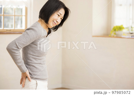 シニア腰痛イメージ 腰を押さえるシニア、ミドル女性