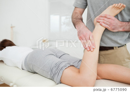 Brunette osteopath stretching a foot