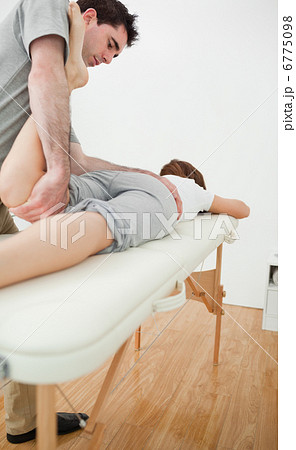 Brunette physiotherapist stretching a leg