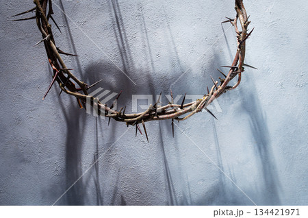 Jesus Crown of thorns shadow silhouette against textured gray surface, symbol spiritual pain and redemptive struggle Banner good friday background, concept for Christian Easter