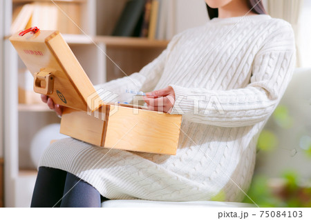 薬箱から薬を取り出す妊婦
