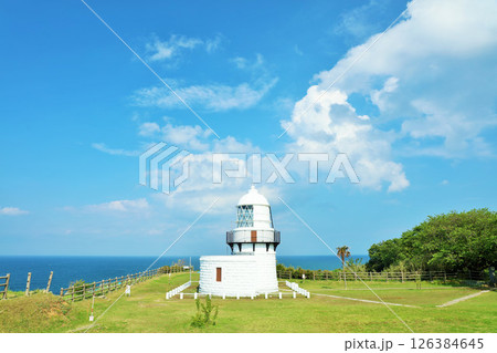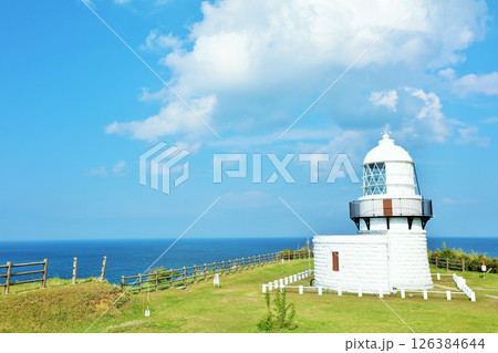 快晴のすがすがしい青空と日本海の水平線を望む、能登半島の禄剛埼灯台