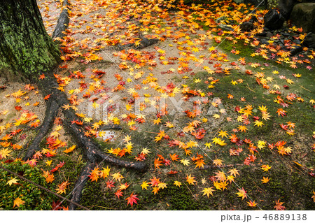 京都の秋、鹿王院の紅葉、秋の夕陽さす本庭のカラフルな紅葉