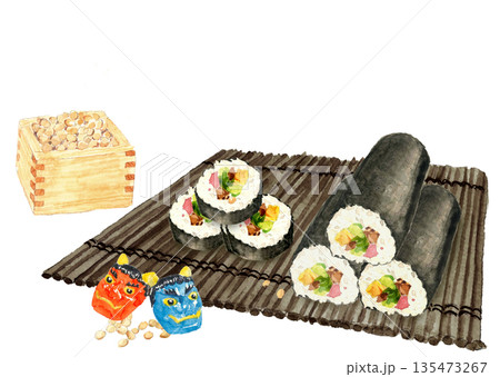水彩で描いた恵方巻と節分のイラストセット素材【手描き】白バック コピースペース