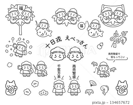 恵比須と大黒天 十日戎 えべっさんのイラストセット 黒い画線