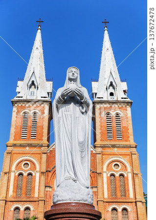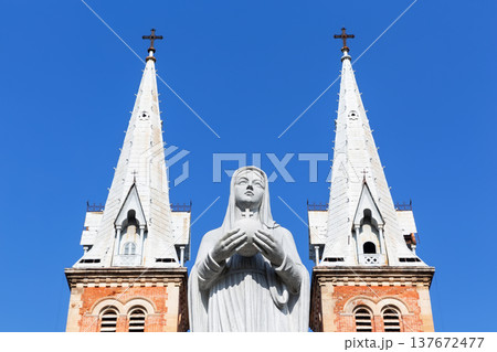 Statue of the Virgin Mary standing in front of the Notre Dame Cathedral Basilica of Saigon in Ho Chi Minh City, Vietnam.