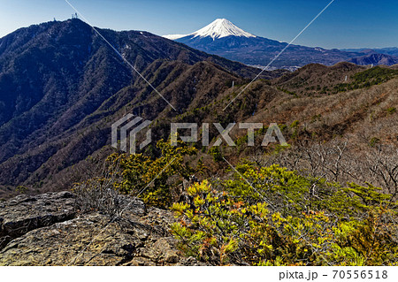本社ヶ丸稜線の岩場から眺める新緑の三ツ峠と残雪の富士山