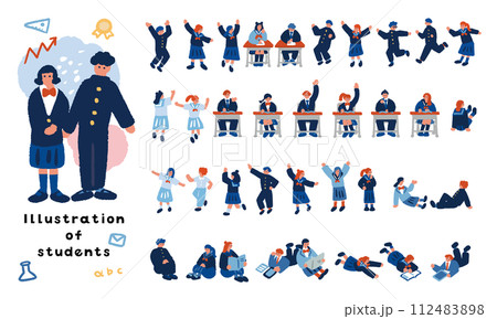 中学生や高校生のイメージイラスト 制服を着た学生のシンプルでフラットなイラストセット