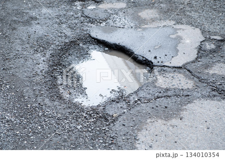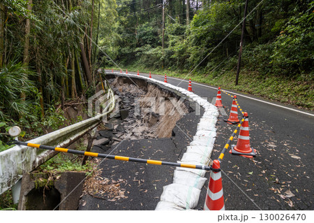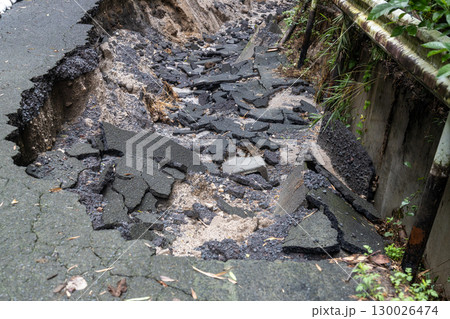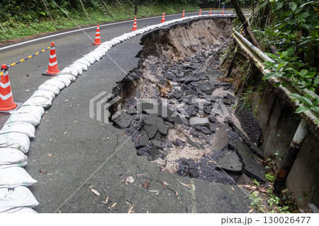 大雨の被害でアスファルトの道路が崩れている 路肩崩壊の素材写真