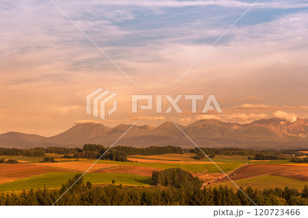 【美瑛町 四季彩の丘から秋の風景と十勝岳連峰】