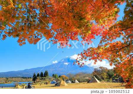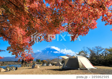 秋のキャンプ場のイメージ 富士山と田貫湖キャンプ場の紅葉