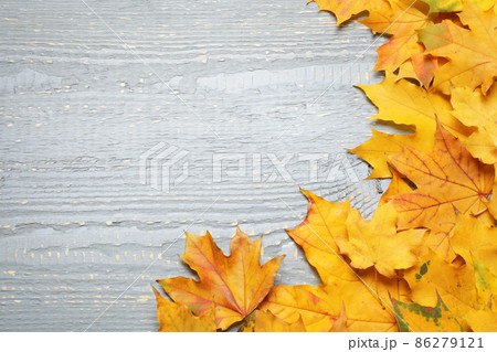 Beautiful autumn leaves and space for text on light grey wooden background, top view
