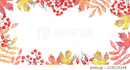 Horizontal autumn frame of maple leaves with rowan and rose hip berries. Watercolor botanical illustration. Hand drawn isolated background. Banner for invitations, Thanksgiving, Halloween quotes.