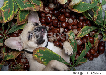 A French bulldog dog lies among a large number of brown chestnut fruits and fallen autumn chestnut leaves.