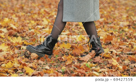 A girl in warm boots walks over the fallen leaves.