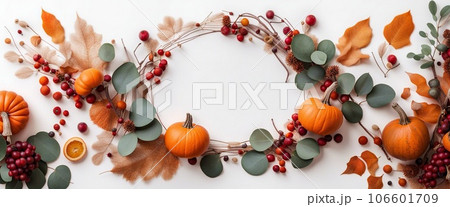Thanksgiving day or Halloween concept banner. Top view white background decor from pumpkin, red berry, green leaves with copy space. autumn and fall season background.