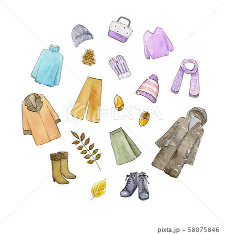 秋冬ファッション 手描き水彩イラスト 円フレーム