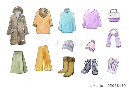 冬のレディースファッション 手描き水彩イラストセット 背景透過