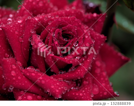 雨の降る10月に美しく咲いた赤いバラの花「ドフトツァーバァ」