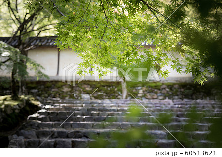 鹿王院に時雨、庭園の築地塀と真っ赤なカエデ