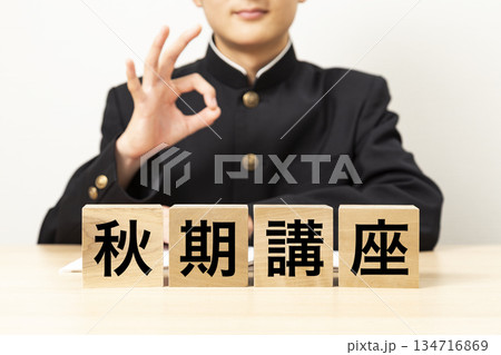 「秋期講習」と書かれたブロックと男子学生